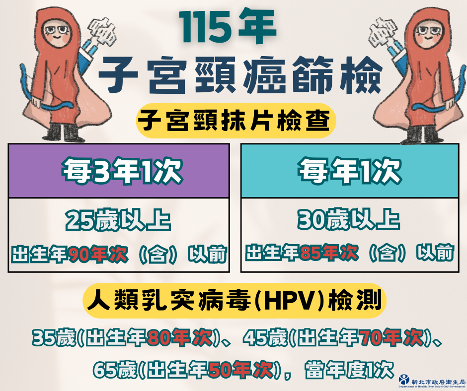 25-29歲(民國86-90年出生)女性,3年1次;30歲(民國85年前出生)以上女性,1年1次。