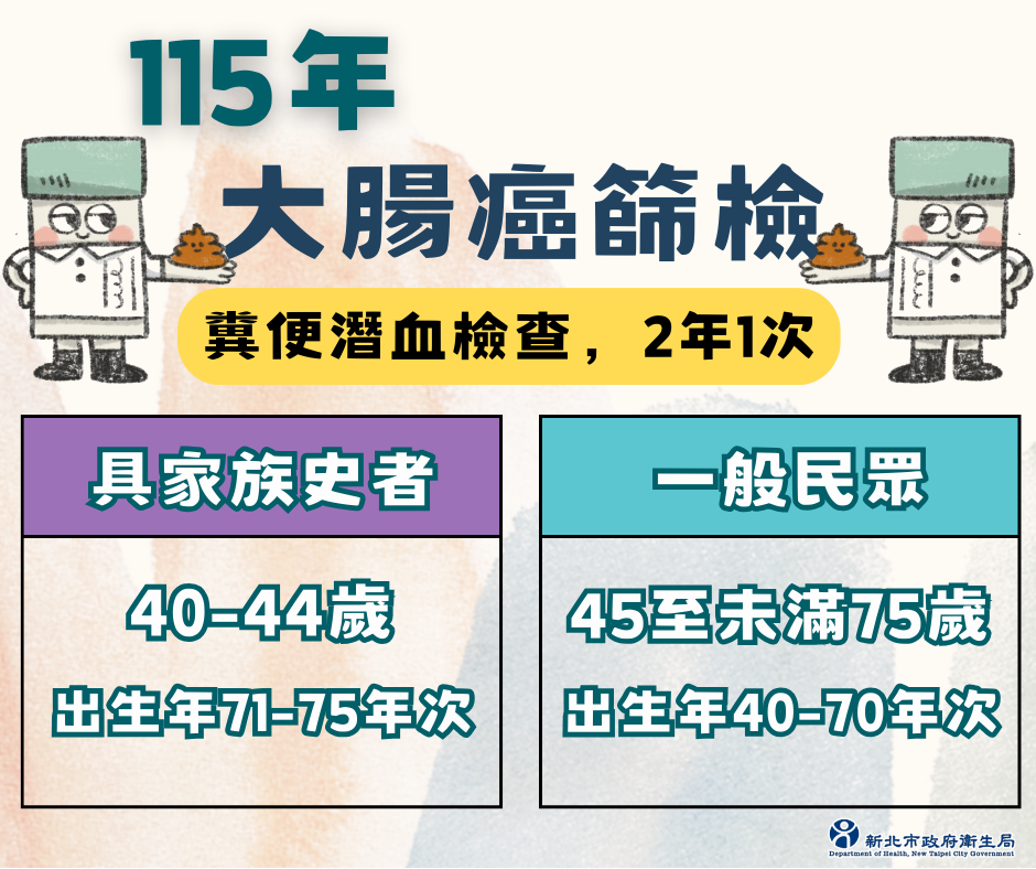 40-44歲(71-75年次)具家族史(出示證明或簽署聲明書) 其父母、子女或兄弟姊妹經診斷為大腸癌者,2年1次。