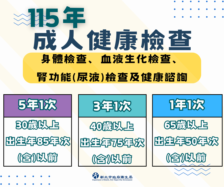 40~64歲(民國51~75年出生),每三年一次;65歲以上(民國50年前出生),每年一次。
