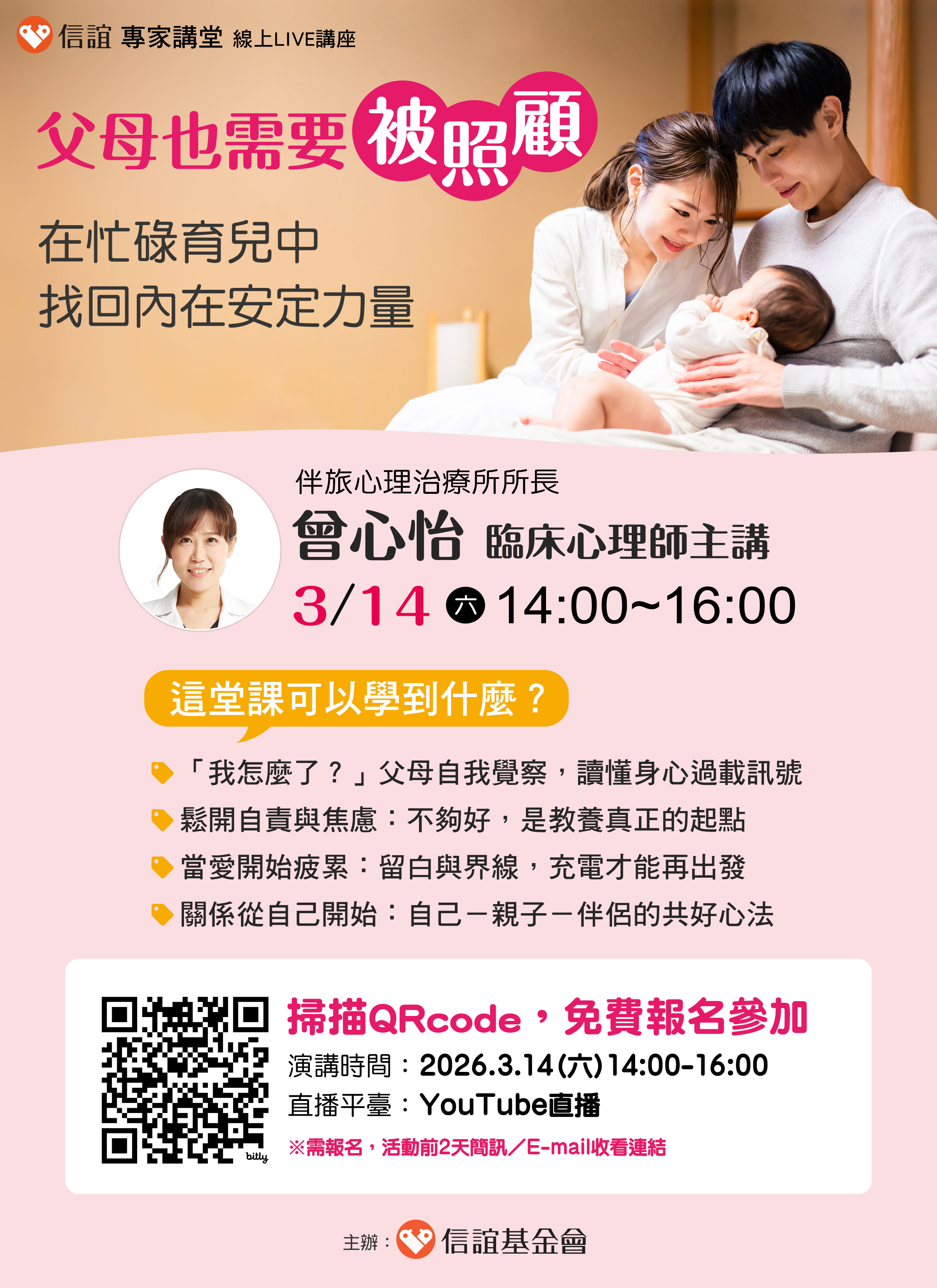 講座將帶領家長讀懂身心過載訊號,學習在育兒、工作與自我拉扯間的實用減壓策略,講座資訊如下: